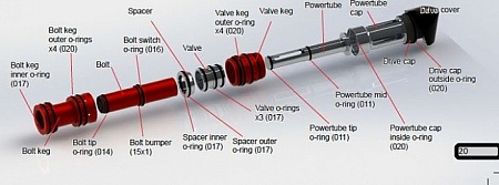 Вторым принципиальным моментом стало решение производителей оставить в новом маркере хорошо зарекомендовавшие себя узлы из предыдущих поколений. Так, например, болтовая группа осталась практически без изменений. Новшествами в ней стали лишь ее задняя часть — специально разработанная в рамках современных тенденций для наискорейшего изъятия из маркера и передняя часть болта. В предыдущих моделях отверстие было одним прямо в центре болта. Следовательно, воздух бил концентрировано в центральную часть шара, это могло приводить к расколу хрупкой краски. Для того, чтобы избежать этой проблемы, производители сделали насадку на переднюю часть. Отверстия для прохода воздуха сделаны по периферийным краям этой насадки так, чтобы единый поток воздуха рассекался и бил не в центр, а по краям шара, еще и подкручивая его. Так же без изменений остался передний регулятор. Скажу откровенно — он никогда не давал сбоев за два года более чем частого использования маркера!! В новое поколение перекочевал в хорошо спроектированный фиднек из модели VX удобный и не соскакивающий с боди.